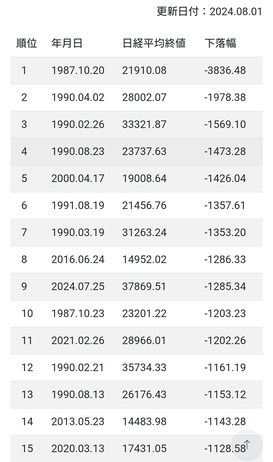 今日の下落率5%だったとしても下落率歴代20位にも入らんわ