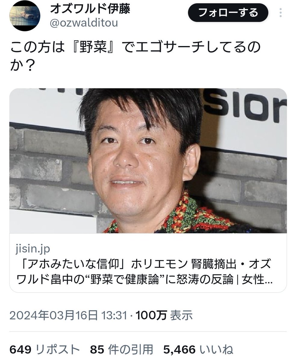 病気なって食生活を見直したってだけの話だったのにネットニュースが勝手に「オズワルド畠中が野菜健康論」ってタイトルの記事にして
