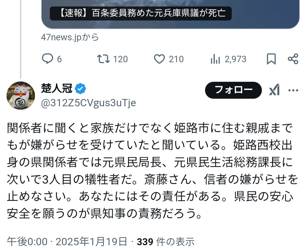 そして、死んだらまた斎藤に擦り付けると。本当にゴミ屑なのが兵庫県の公務員なんだなと思った