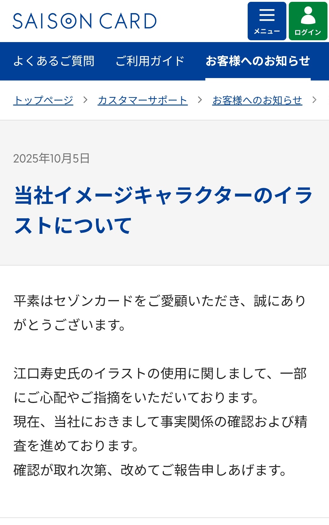 確認が取れ次第、改めてご報告申しあげます。https://www.saisoncard.co.jp/customer-support/information/20251005/